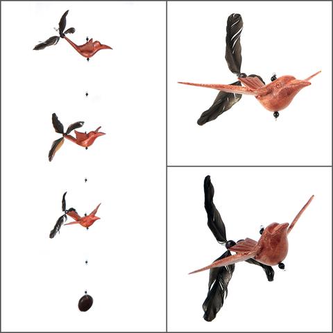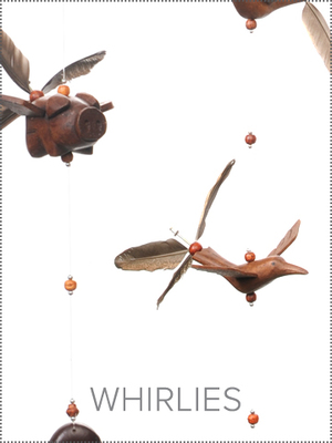 Our hand crafted whirly mobiles dance in the wind, their feather pinwheels spin with the slightest breeze. Quirky and kinetic, the carved whirly elephants, birds, pigs and other animals are a joy to behold.